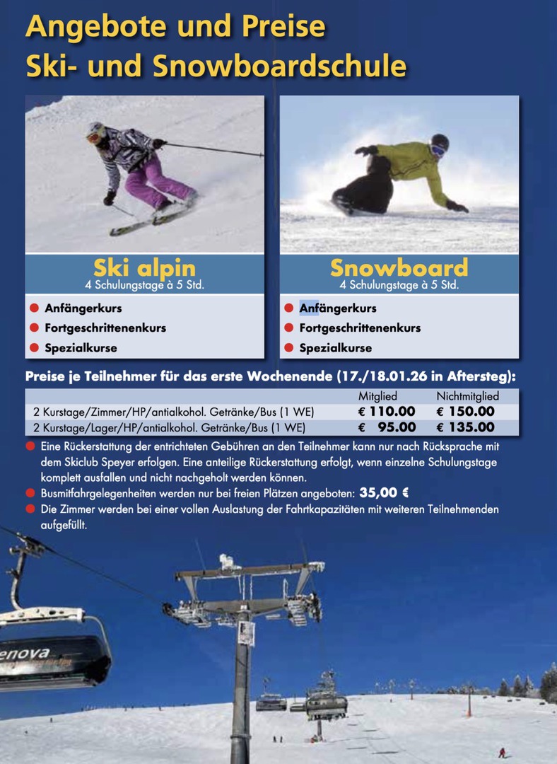 Die Vorbereitungen für unsere beliebten Ski- und Snowboardkurse in unserer urigen Skiclub-Hütte in Aftersteg sind in vollem Gange und wir freuen uns euch zwei erlebnisreiche, spaßige und lehrreiche Wochenenden im Januar 2026 anzubieten: